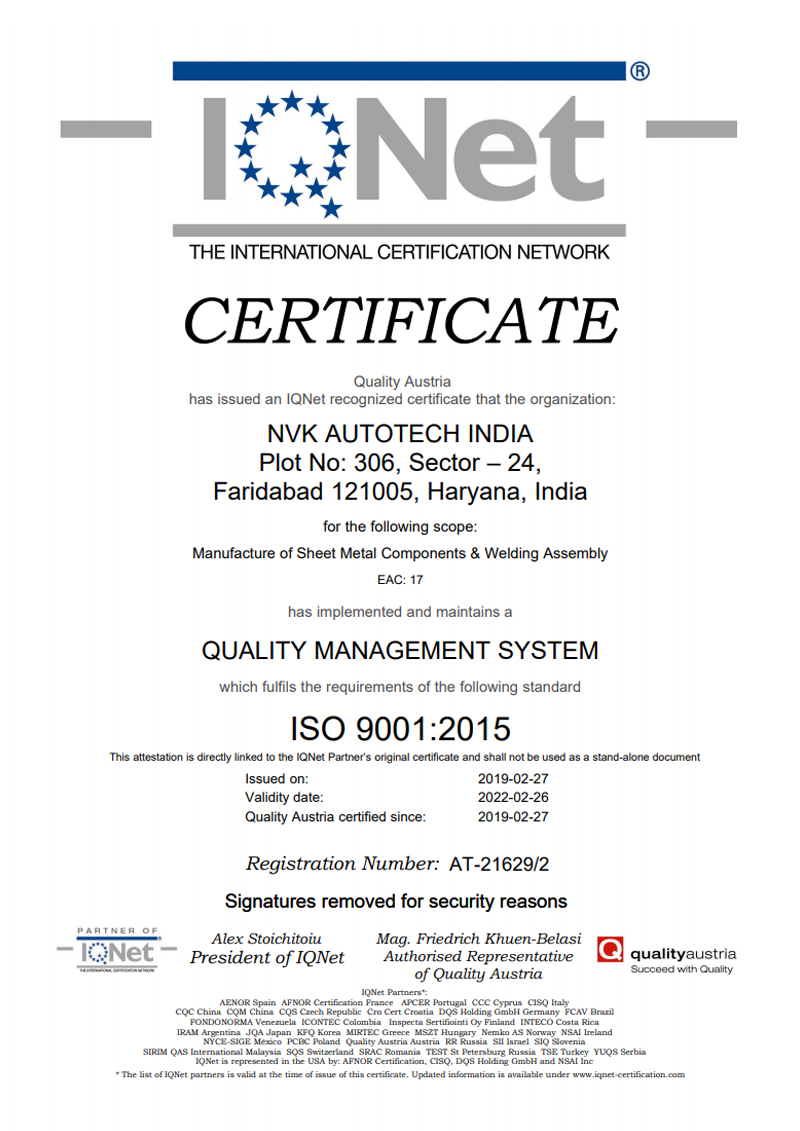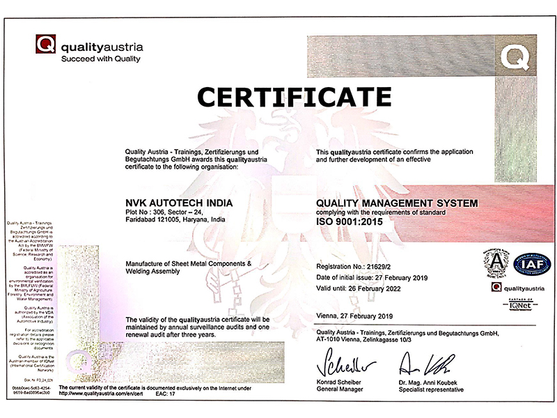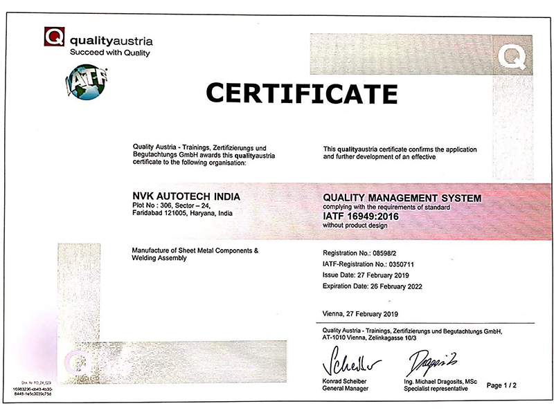 IATF 16949:2016 & ISO 9001:2015 certified from Quality Austria CB.